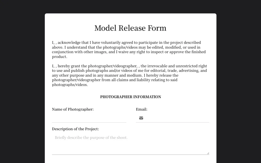 If you want to get a little fancy, there are some great third-party services for model release forms: