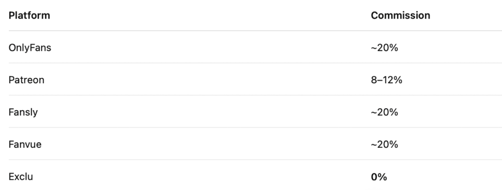 Because Exclu does not charge platform commissions, creators can keep significantly more revenue compared to subscription platforms.